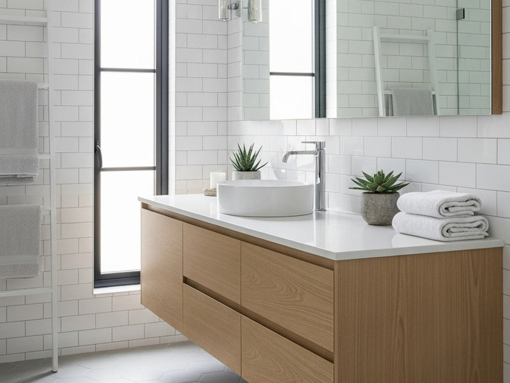 Matériaux résistants à l’humidité, faciles à nettoyer, pour une salle de bain qui tient dans le temps.